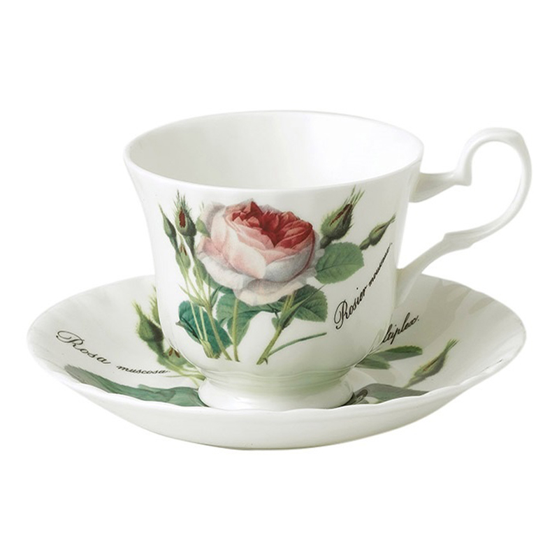 Herbaciana filiżanka na nóżce ze spodkiem wykonana z wysokiej jakości, angielskiej porcelany przez prestiżową firmę Roy Kirkham.