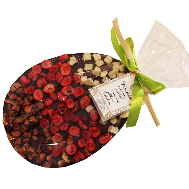 Wspaniały smak ciemnej czekolady w niebanalnym połączeniu z żurawiną, jabłkiem i śliwką. Idealnie nadaje się do koszyczka wielkanocnego oraz do dekoracji.