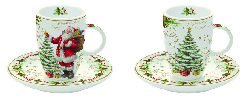 Klasyczne, porcelanowe filiżanki espresso o prostym kształcie w świąteczne wzory. Posiadają wygodne uszka. Mogą być ciekawym pomysłem na prezent.