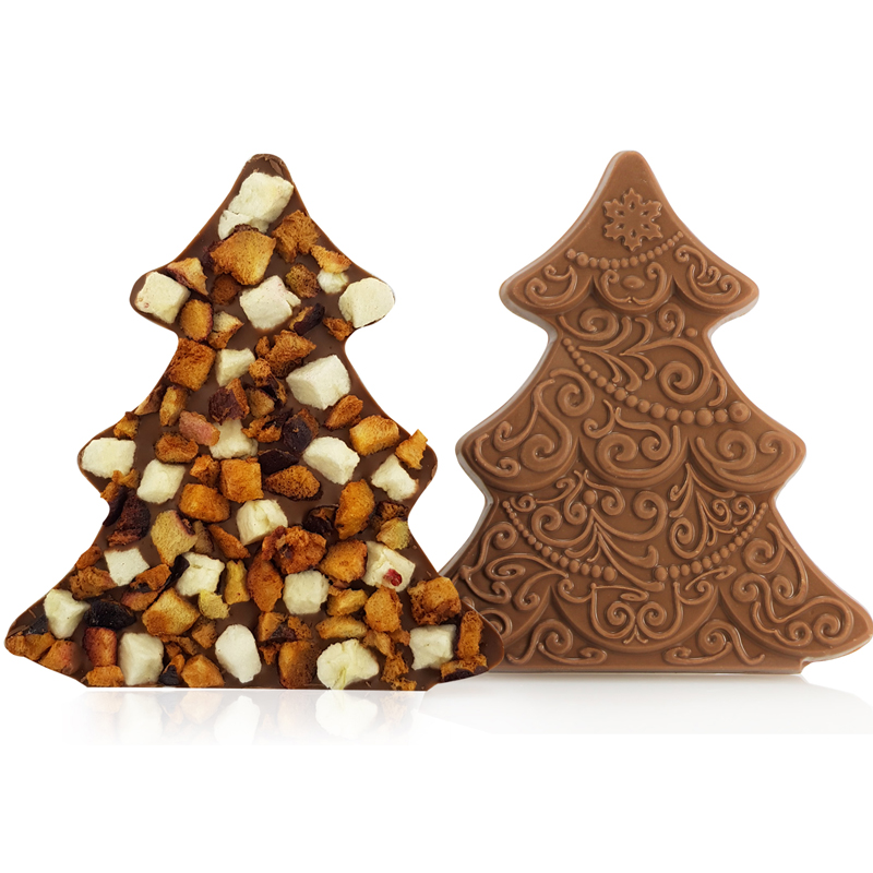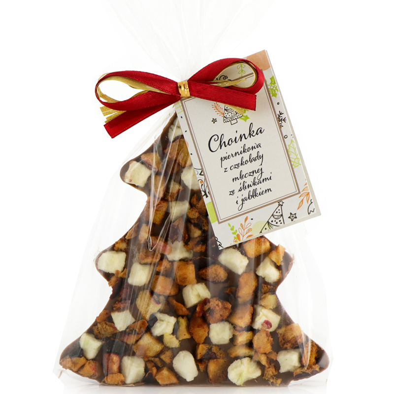 Choinka z mlecznej czekolady posypana dużymi kawałkami śliwki z dodatkiem przyprawy piernikowej. Niespotykana kompozycja nadaje jej wyjątkowy smak.