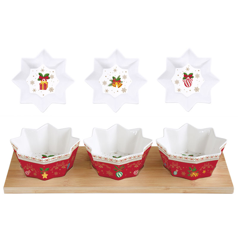 Komplet trzech miseczek na bambusowej tacy. Miseczki w kształcie gwiazdek. Mogą być ciekawym pomysłem na prezent.
