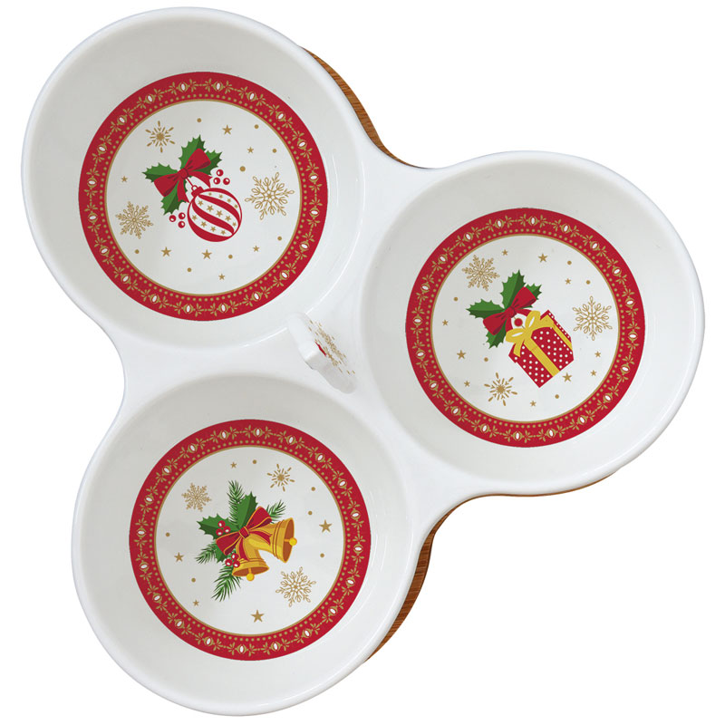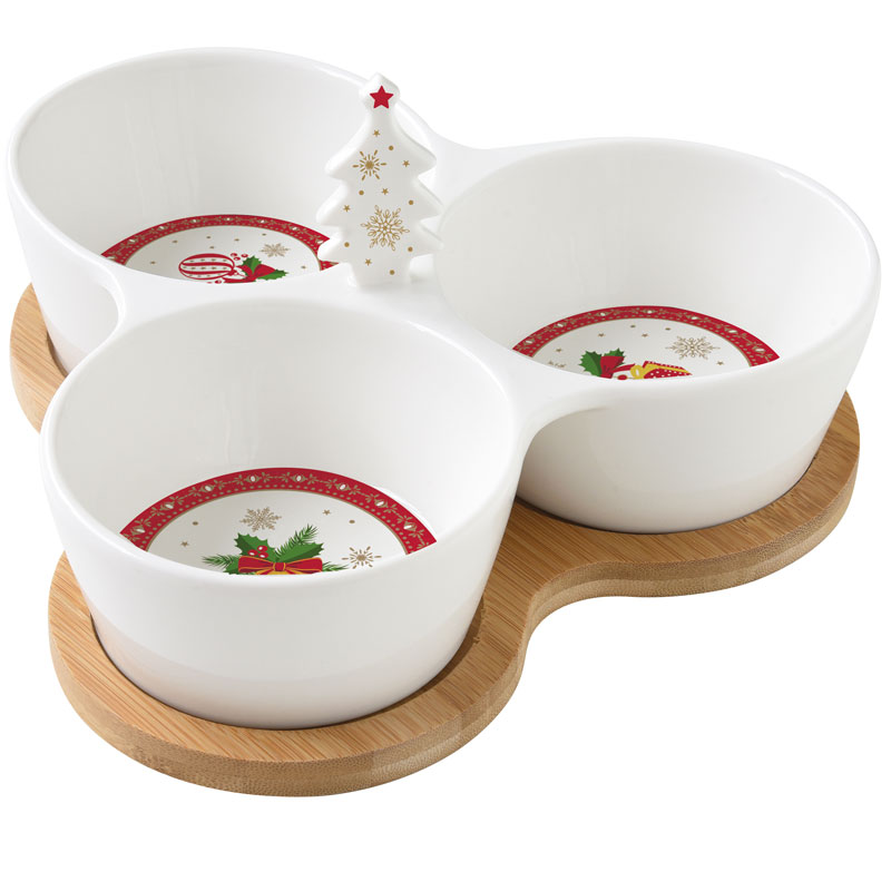 Komplet trzech miseczek na bambusowej tacy. Miseczki w klasycznym kształcie. Mogą być ciekawym pomysłem na prezent.