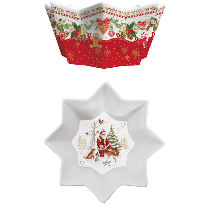 Pojemna miska w kształcie gwiazdy w piękne świąteczne wzory. Miska zapakowana jest w pudełko w takim samym motywie kolorystycznym. Może być ciekawym upominkiem.