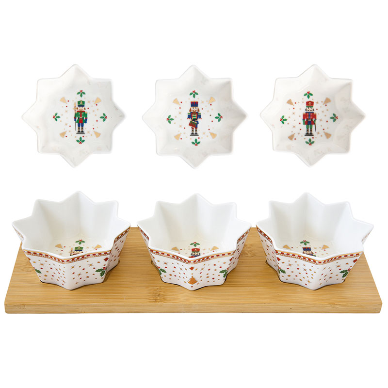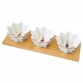 Komplet trzech miseczek na bambusowej tacy. Miseczki w kształcie gwiazdek. Mogą być ciekawym pomysłem na prezent.