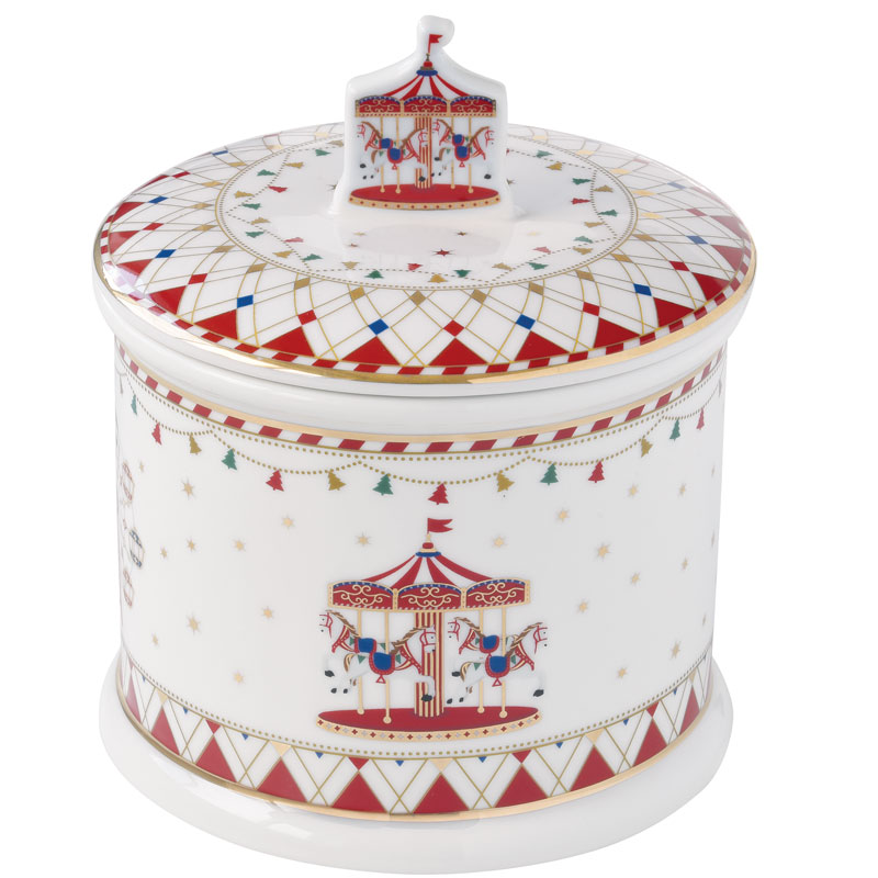 Kolorowy pojemnik wykonany z porcelany w wyjątkowym kształcie udekorowany świątecznym wzorem. Pojemnik jest zapakowany w pudełko w takim samym motywie kolorystycznym. Może być ciekawym upominkiem.