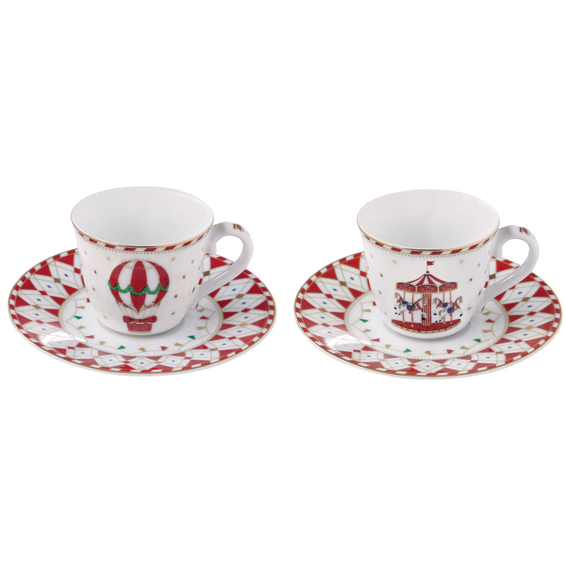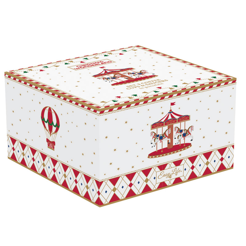 Kolorowe filiżanki wykonane z porcelany w wyjątkowym kształcie, udekorowane świątecznym wzorem. Filiżanki są zapakowane w pudełko w takim samym motywie kolorystycznym. Mogą być ciekawym upominkiem.