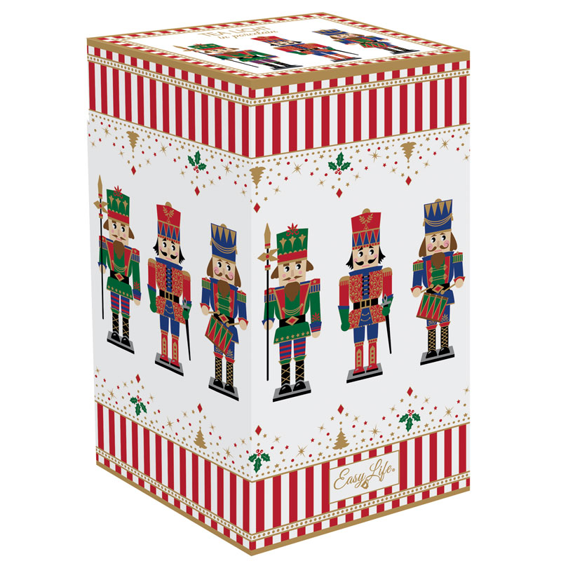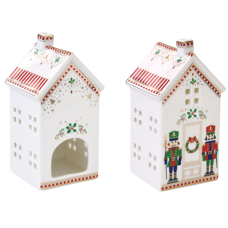 Porcelanowy świecznik w kształcie domku pojemniczków w świąteczne wzory. Może być ciekawym pomysłem na prezent.