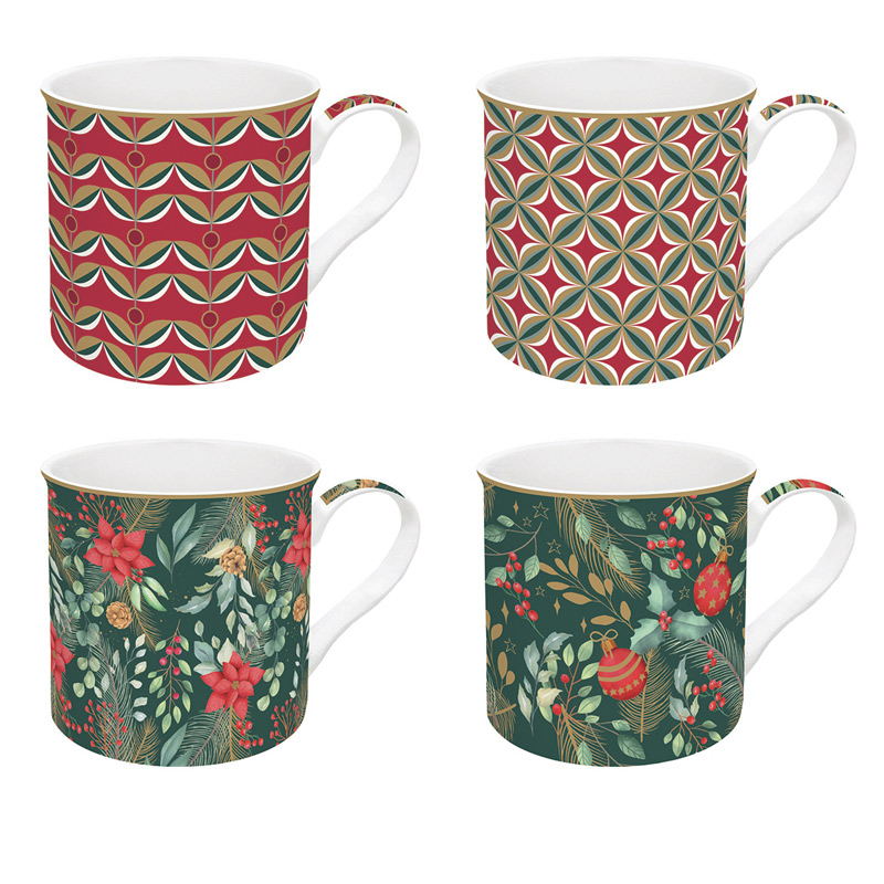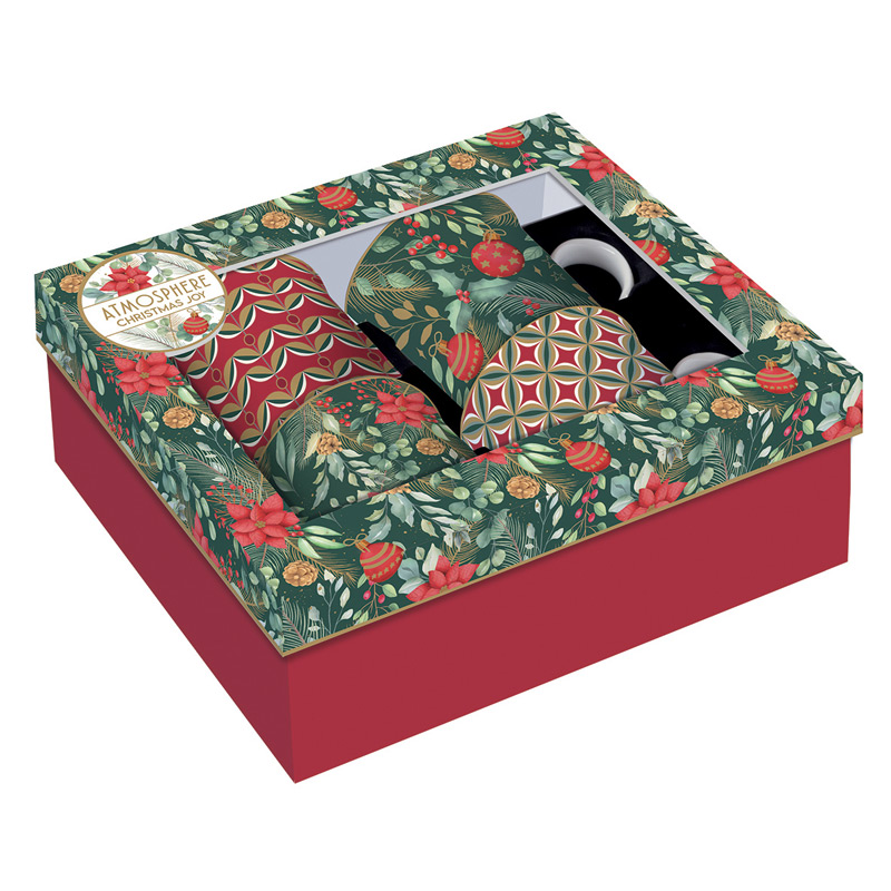 Przepiękny komplet kubków w świątecznym wzorze. Zapakowane w ozdobne pudełko idealnie nadają się na prezent.