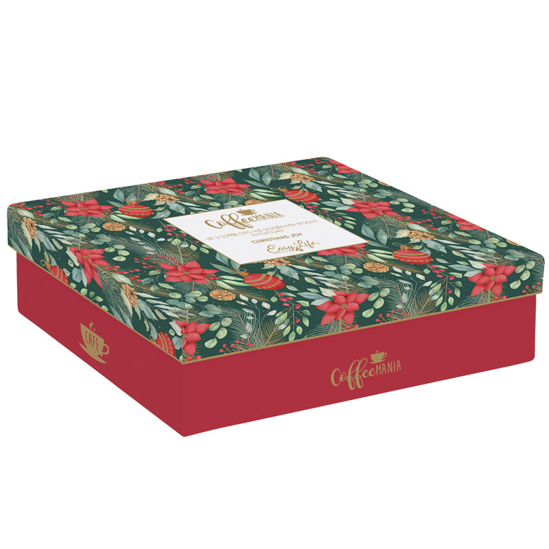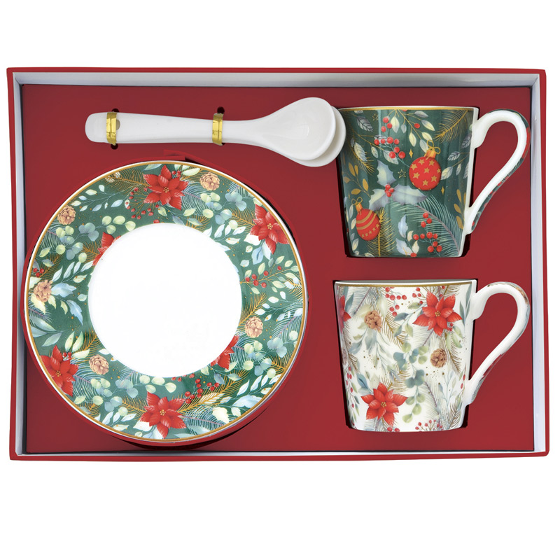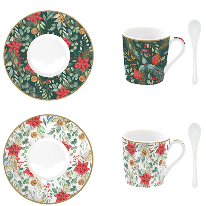 Przepiękny komplet dwóch filiżanek espresso z łyżeczkami w świątecznym wzorze. Zapakowane w ozdobne pudełko idealnie nadają się na prezent.