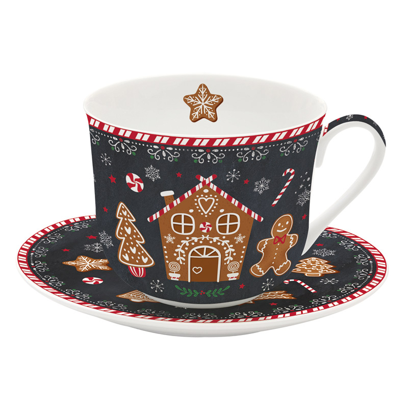 Porcelanowa filiżanka śniadaniowa ze wzorem piernikowego ludzika w antracytowym kolorze. W komplecie posiada talerzyk oraz tekturowe pudełko, dzięki czemu idealnie nadaje się na prezent.