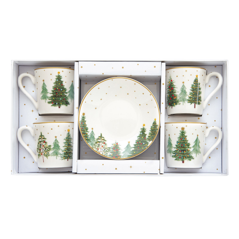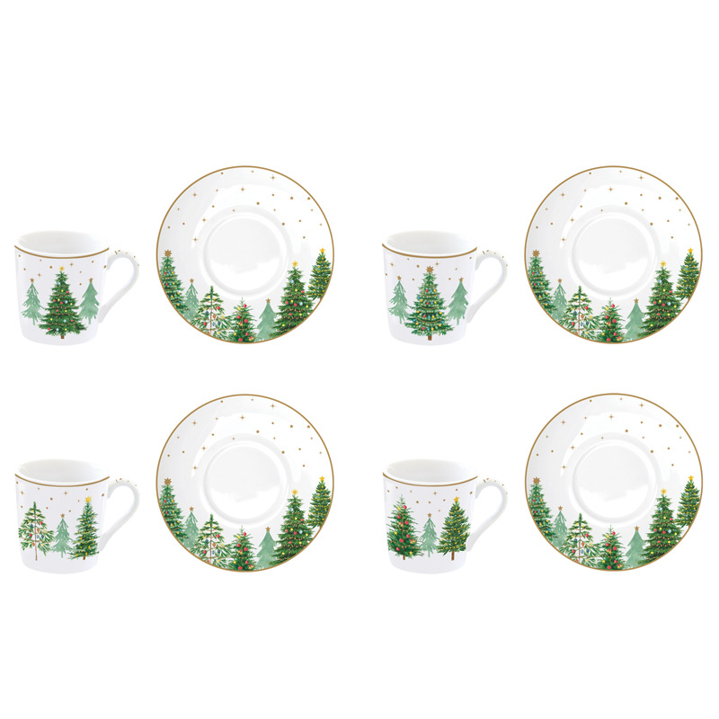 Przepiękny komplet świątecznych filiżanek do espresso ze spodeczkami. Cztery różne wzory filiżanek w tej samej kolorystyce. Komplet zapakowany w ozdobne pudełko idealnie nadaje się na prezent.