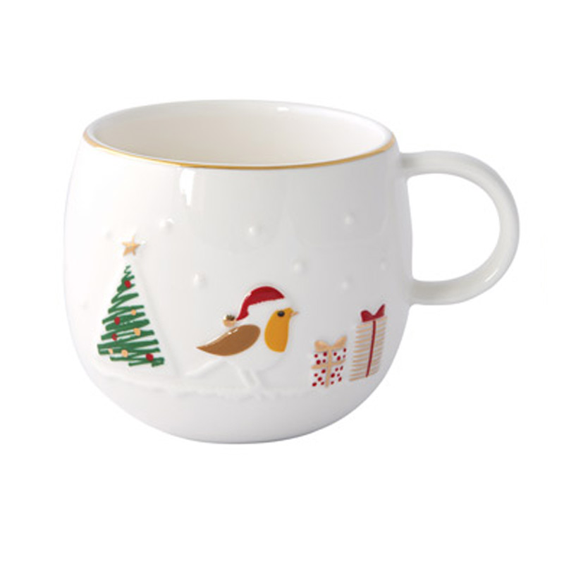 Kubek wykonany z porcelany w kształcie baryłki udekorowany świątecznym wzorem. Może być ciekawym upominkiem.