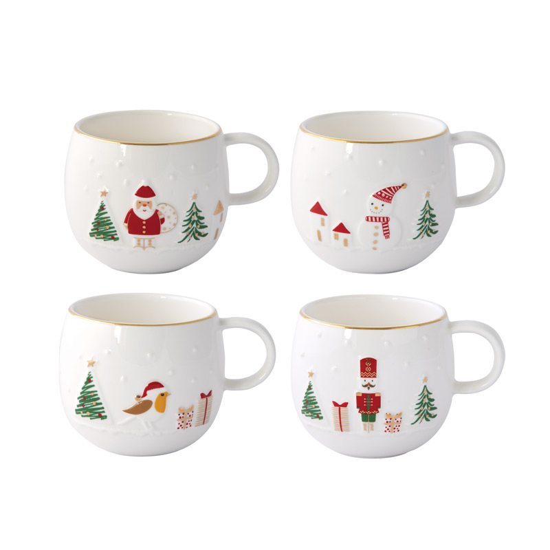 Zestaw kubków wykonanych z porcelany w kształcie baryłki, udekorowanych świątecznymi wzorami: mikołajem, bałwankiem, ptaszkiem, żołnierzykiem. Zestaw może być ciekawym upominkiem.