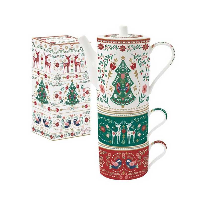 Wygodne filiżanki i dzbanek wykonane z porcelany o ciekawym kształcie w świąteczne wzory z wygodnym dużym uchem. Komplet ułożony razem na sobie tworzą spójną wieżę. Pojemność dzbanka 500ml, pojemność filiżanek 240ml. Zestaw zapakowany jest w pudełko w takim samym motywie kolorystycznym. Mogą być ciekawym upominkiem.