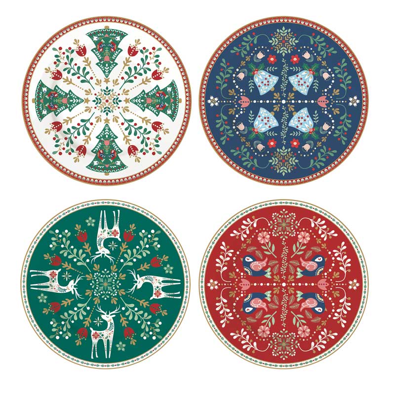 Przepiękne talerzyki deserowe wykonane z porcelany w świąteczne wzory. Talerze zapakowane są w pudełko w takim samym motywie kolorystycznym. Mogą być ciekawym upominkiem.