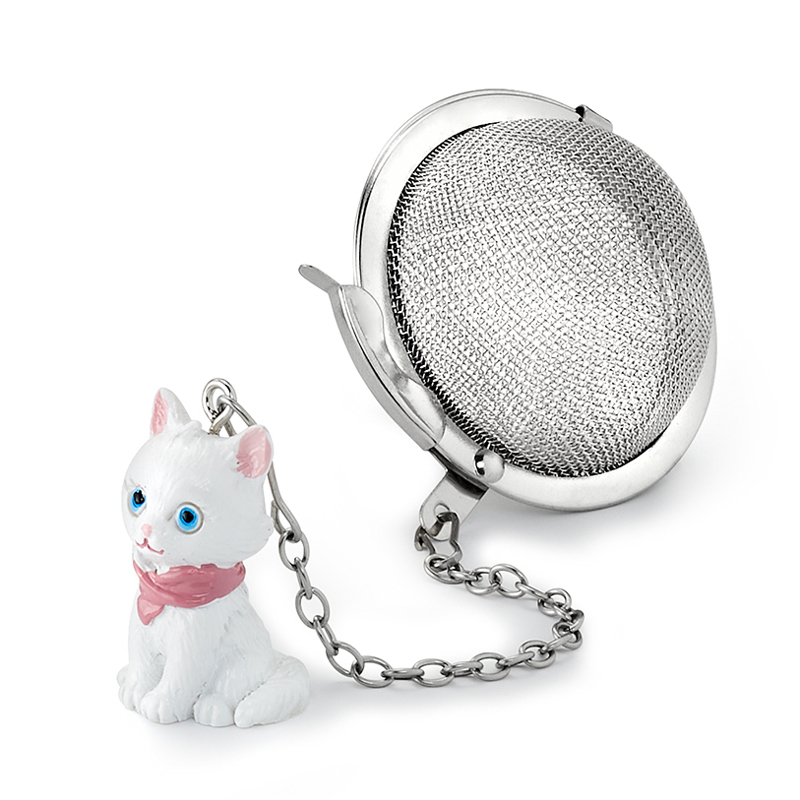 Praktyczny zaparzacz w kształcie kuli wykonany z drobnej siatki ze stalową obwódką i łańcuszkiem umożliwiającym przymocowanie go do brzegu naczynia.