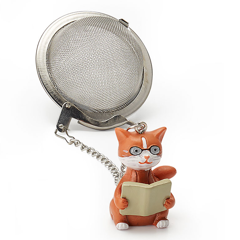 Praktyczny zaparzacz w kształcie kuli wykonany z drobnej siatki ze stalową obwódką i łańcuszkiem umożliwiającym przymocowanie go do brzegu naczynia.