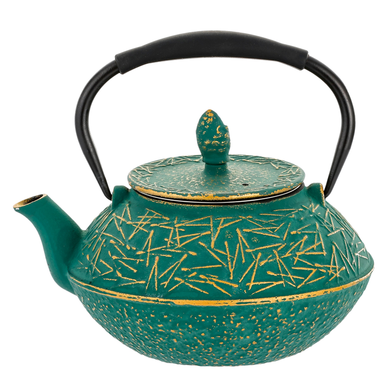 Żeliwny imbryczek do herbaty w zielonym kolorze z ciekawą wytłaczaną fakturą stanowi ozdobę każdego stołu.