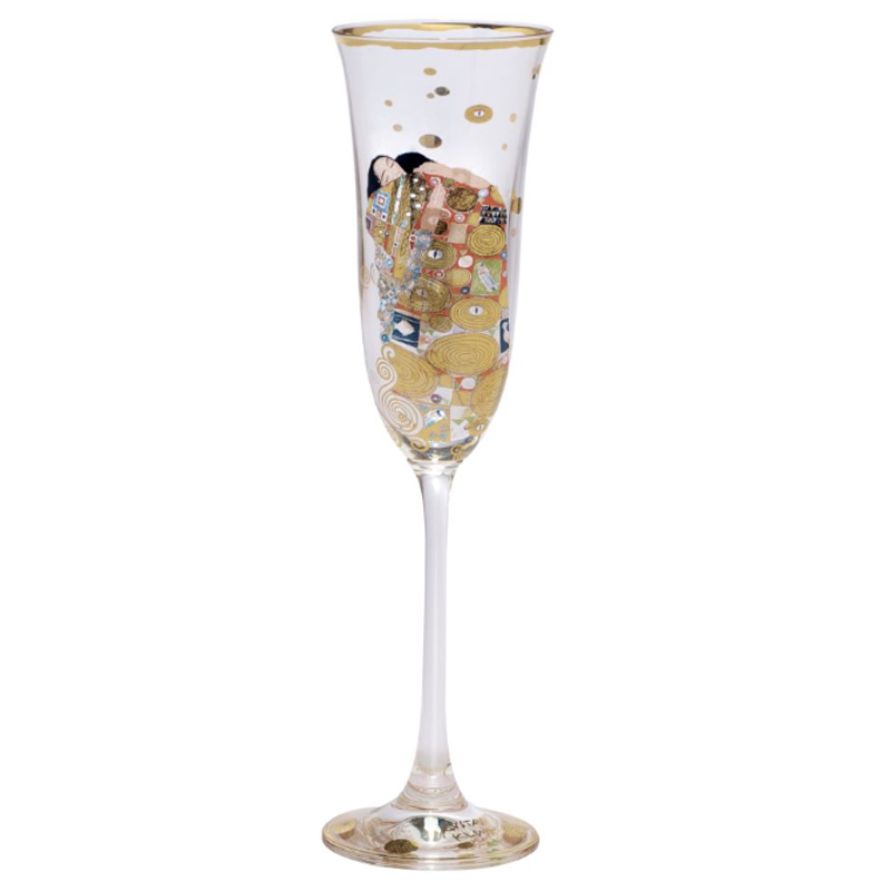 Szklany kieliszek na smukłej nóżce, ozdobiony reprodukcją obrazu G. Klimt 'Spełnienie'